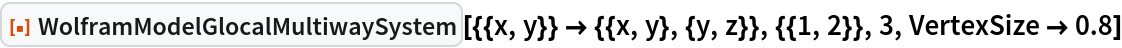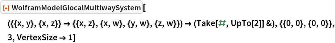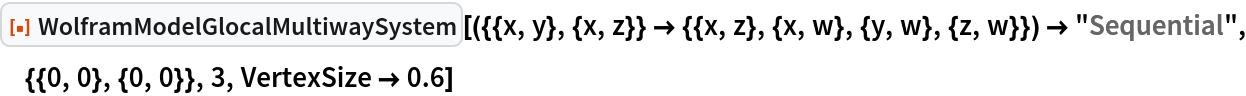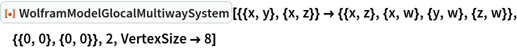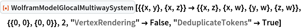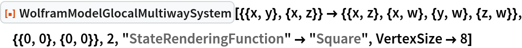 ResourceFunction["WolframModelGlocalMultiwaySystem"][rules,init,n] generates the results of n steps in the glocal multiway evolution of a Wolfram model system with the specified rules, starting from initial conditions init. | |