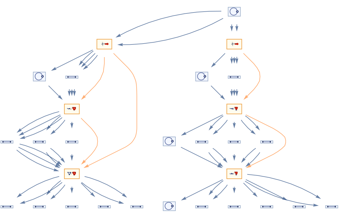 Generate evolution causal graphs (token event graphs) for two simple Wolfram model glocal multiway systems: