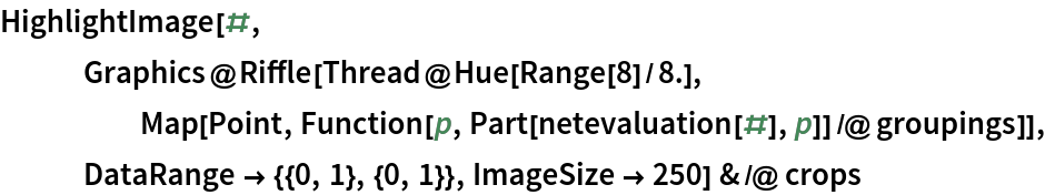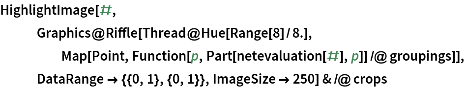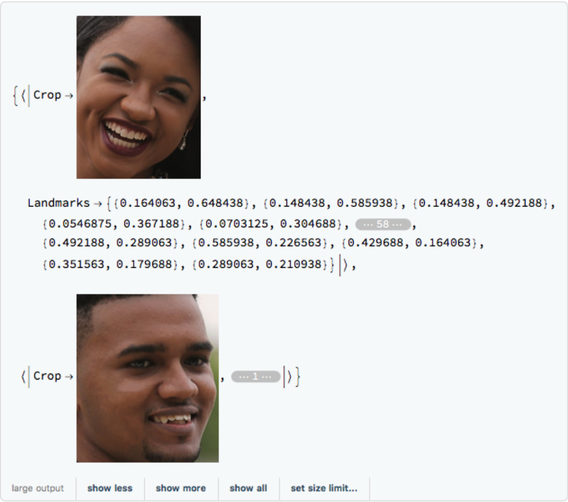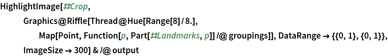Get the landmarks using the evaluation function. Coordinates are rescaled to the input image size so that the bottom-left corner is identified by {0, 0} and the top-right corner by {1, 1}: