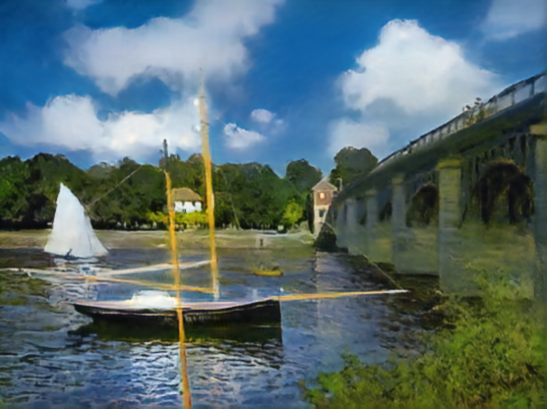 Released in 2017, this model exploits a novel technique for image translation, in which two models translating from A to B and vice versa are trained jointly with adversarial training. In addition to the adversarial loss, cycle consistency is also enforced in the loss function: when the output of the first translator is fed into the second, the final result is encouraged to match the input of the first translator. This allows successful training for image translation tasks in which only unpaired training data can be collected. This model was trained to translate Monet-style paintings into photos.