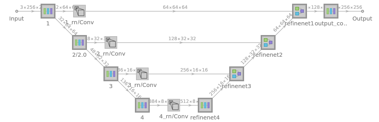 The net resizes the input image to 256x256 pixels and produces a depth map of the same size: