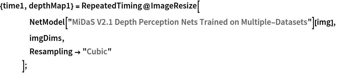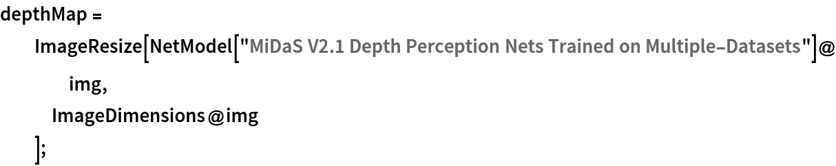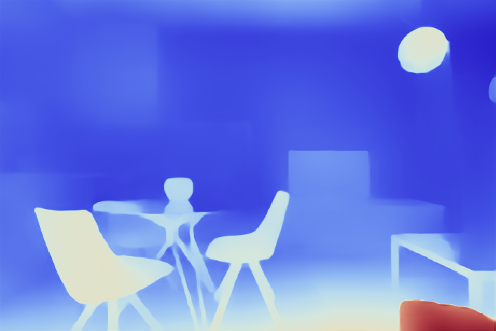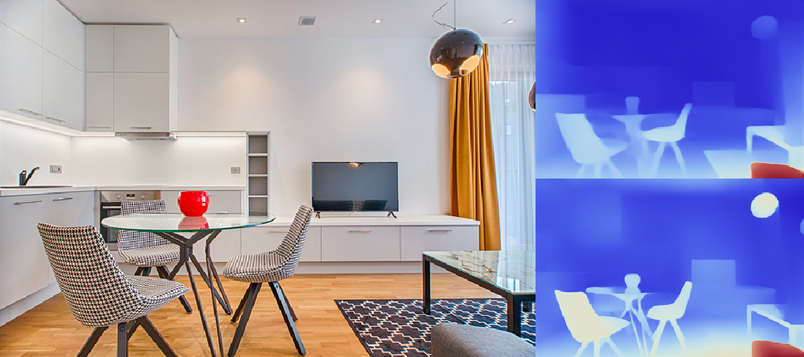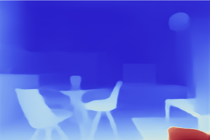Compare the results. Notice that the depth map obtained by resizing the net output (top-right corner, depthMap1) more accurately predicts the depth of the roof lamp and the carpet but is less accurate at predicting the depth of the background furniture: