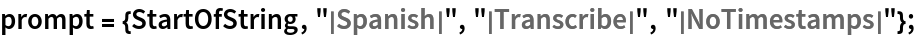 The initial prompt for the decoder is a sequence of context tokens that guides Whisper's decoding process by specifying the task to perform and the audio's language. These tokens can be hard-coded to explicitly control the output or left flexible, allowing the model to automatically detect the language and task. Define the initial prompt for transcribing audio in Spanish: