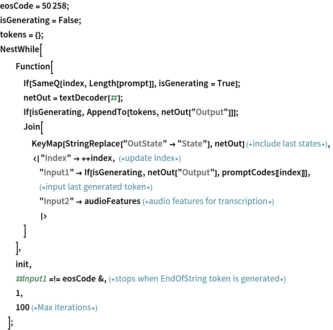 Use the decoder iteratively to transcribe the audio. The recursion keeps going until the EndOfString token is generated or the maximum number of iterations is reached: