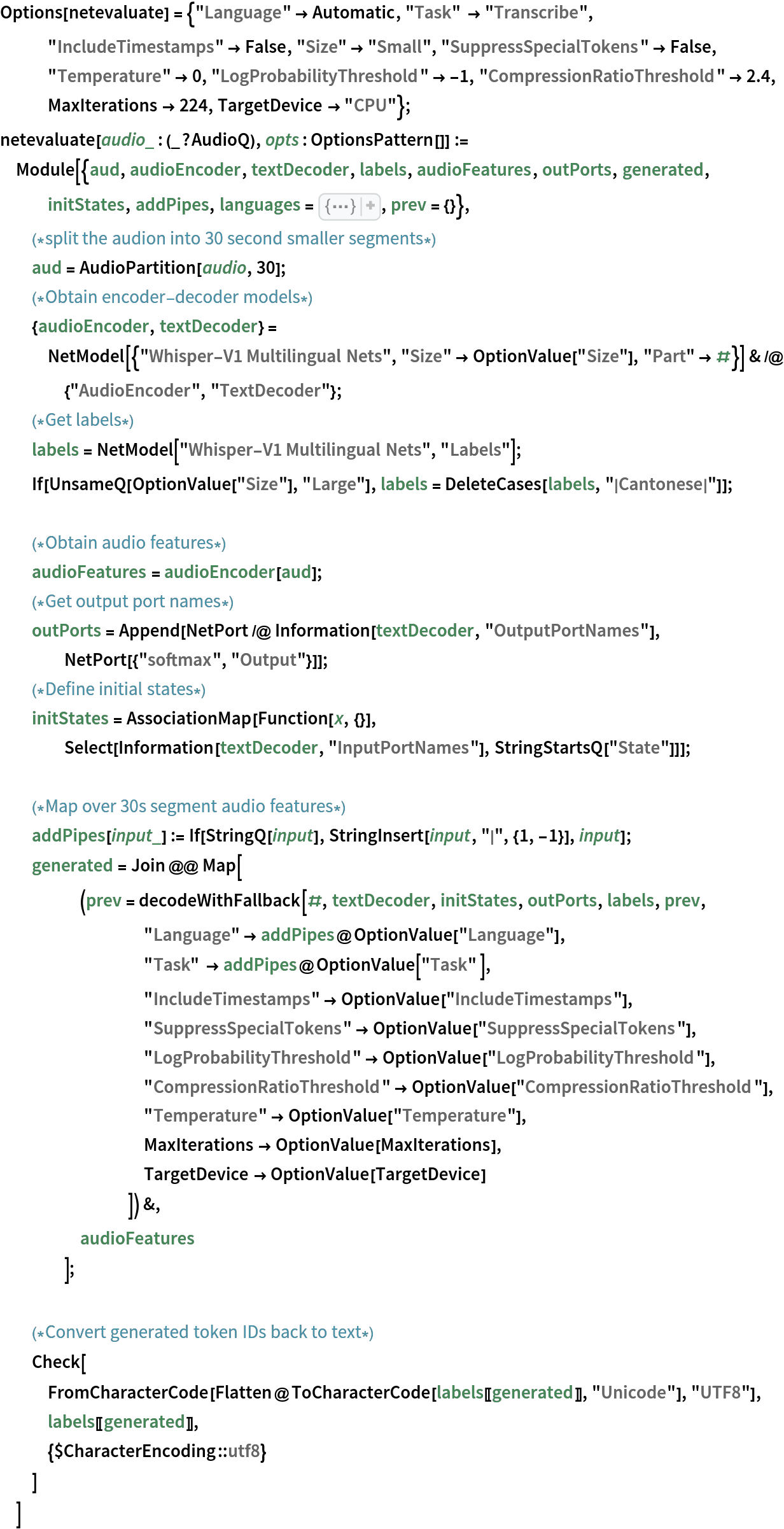 Define a function to detect the language of the audio sample. Whisper determines the language by selecting the most likely language token after the initial pass of the decoder (the following code needs definitions from the "Evaluation function" section):