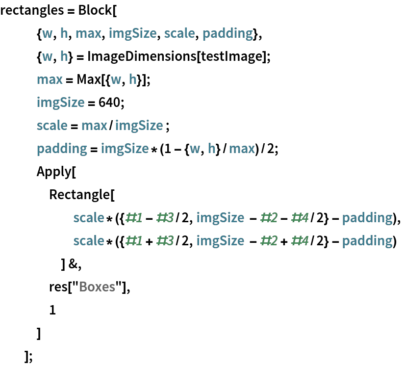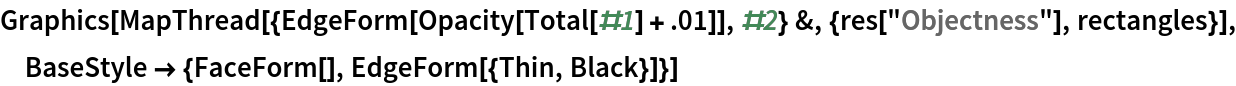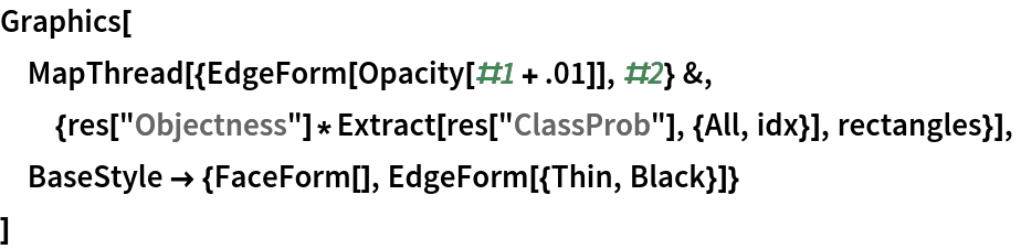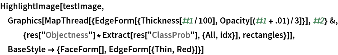 Rescale the bounding boxes to the coordinates of the input image and visualize them scaled by their "objectness" measures: