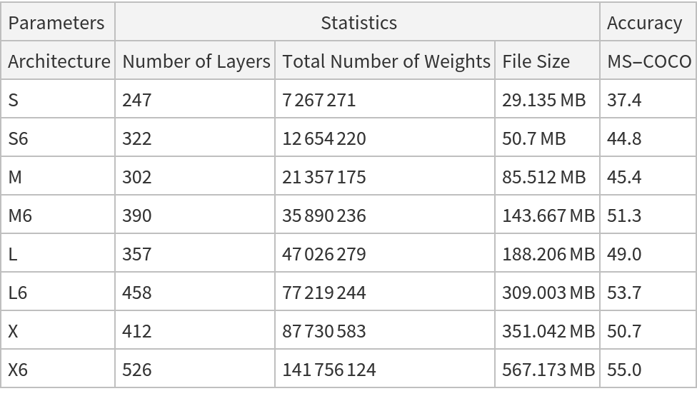 YOLO (You Only Look Once) Version 5 is a family of object detection models published in June 2020. It is a single-stage architecture that goes straight from image pixels to bounding box coordinates and class probabilities. YOLO Version 5 employs the Cross Stage Partial Networks (CSPNet) technique in its backbone to extract rich and informative features from the input image, implements the PA-NET neck for feature aggregation and uses the SiLU function for its activations. Its training leverages several novel data augmentation techniques such as mosaic augmentation and cutout (also used in YOLO Version 4), helping the model to recognize small objects. The YOLO Version 5 S model is about 90% smaller than YOLOv4-custom (with Darknet architecture), meaning that it can be deployed to embedded devices much more easily. It is also faster in both training and inference, achieving 140 frames per second in batch.