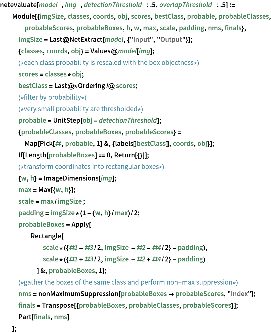 Write an evaluation function to scale the result to the input image size and suppress the least probable detections: