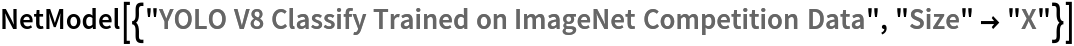 NetModel[{"YOLO V8 Classify Trained on ImageNet Competition Data", "Size" -> "X"}]