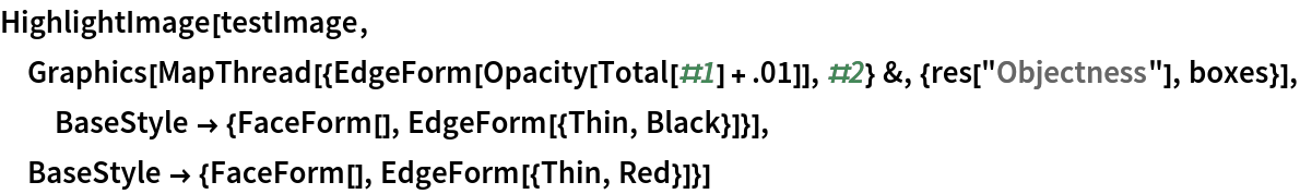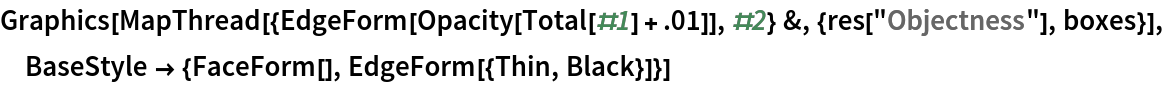 Rescale the bounding boxes to the coordinates of the input image and visualize them scaled by their "Objectness" measures: