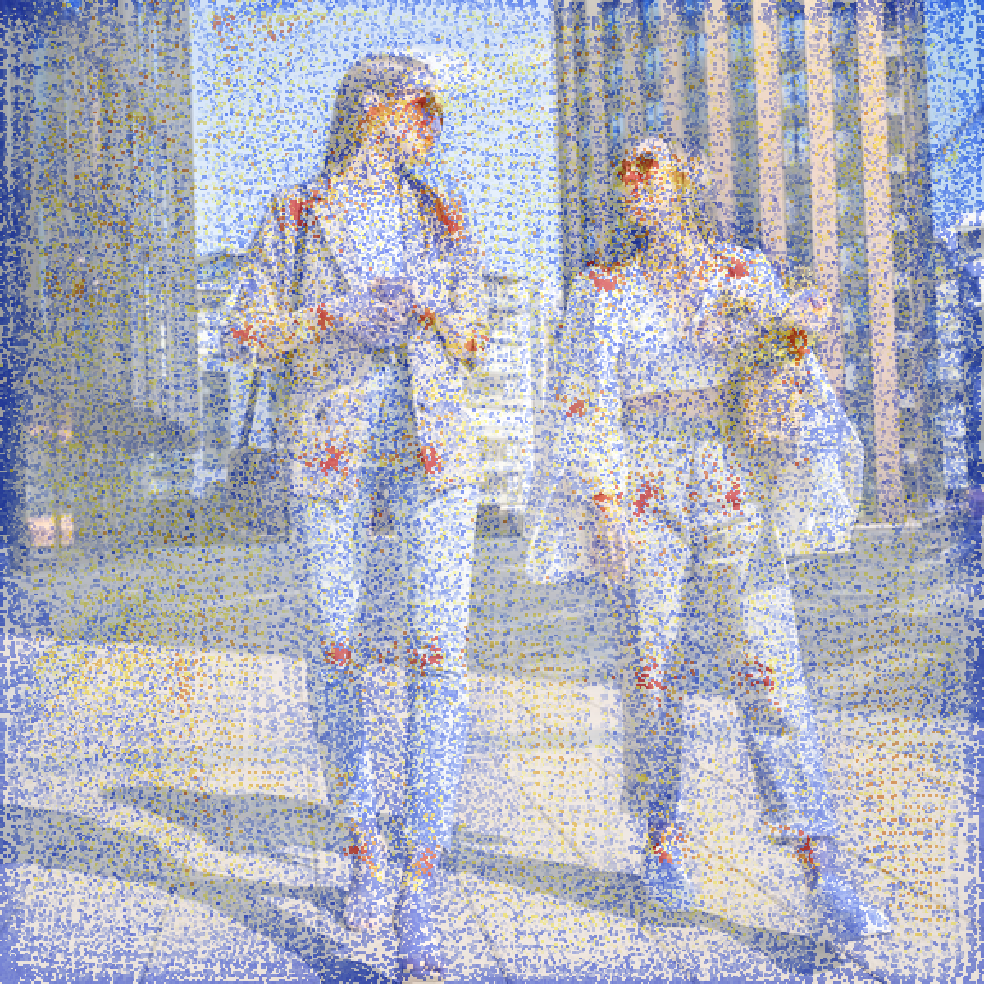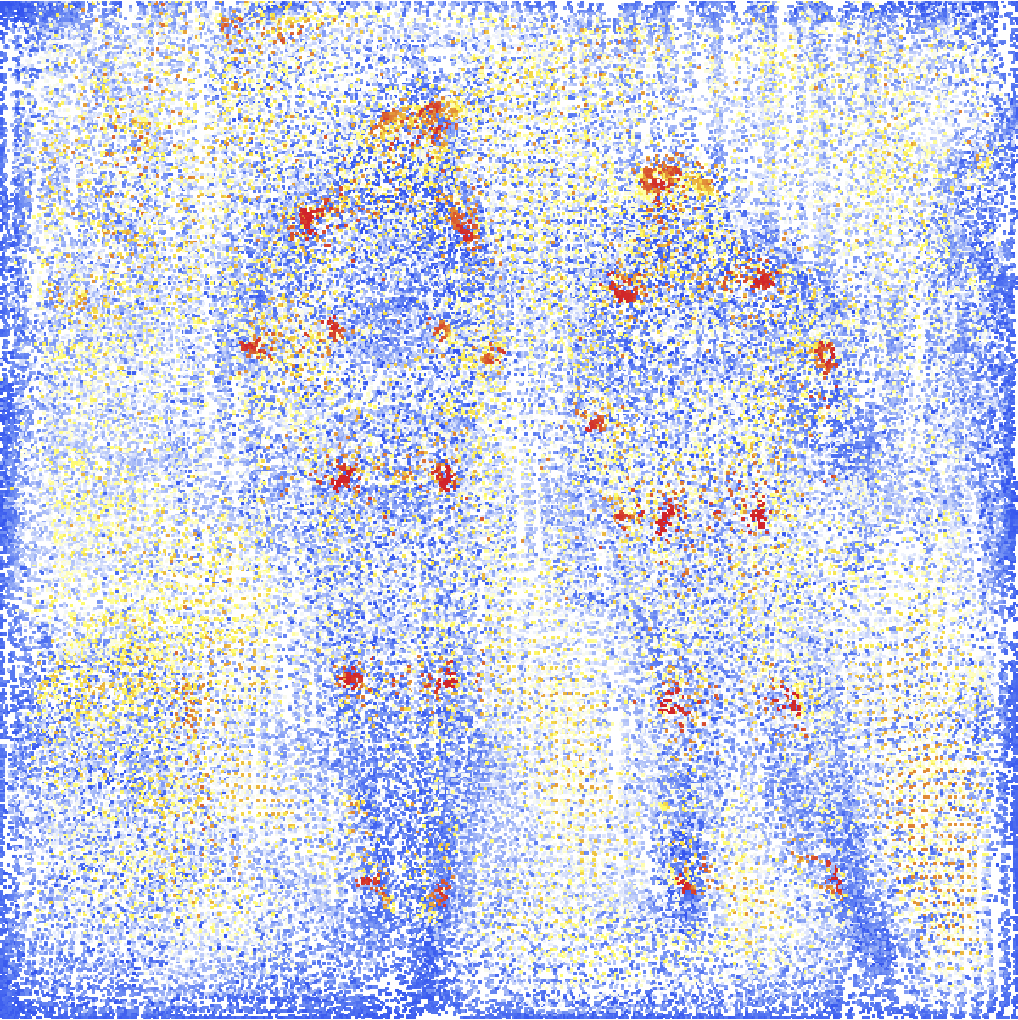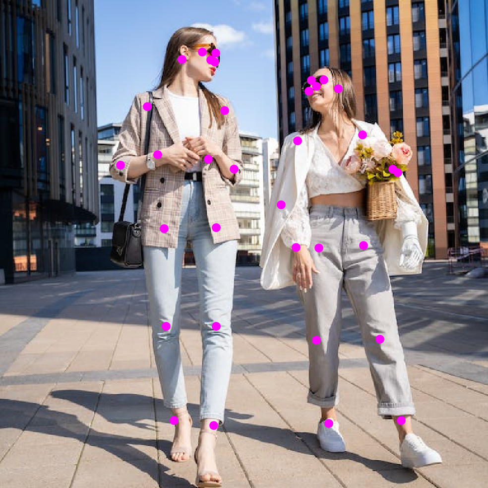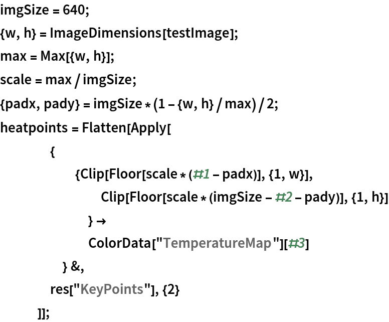 Rescale the "KeyPoints" to the coordinates of the input image and visualize them scaled and colored by their probability measures: