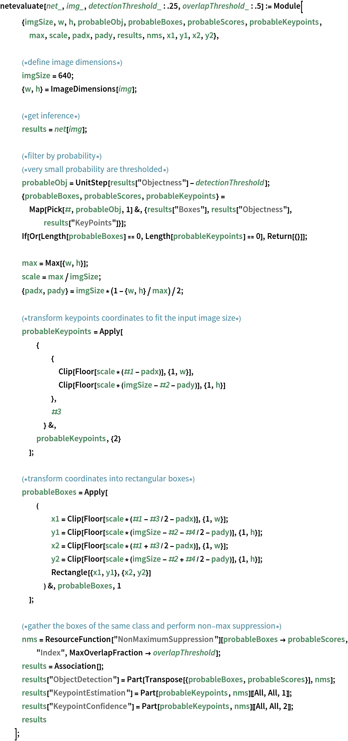 Write an evaluation function to scale the result to the input image size and suppress the least probable detections: