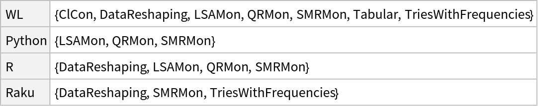 Show the programming languages and software packages that have DSL examples: