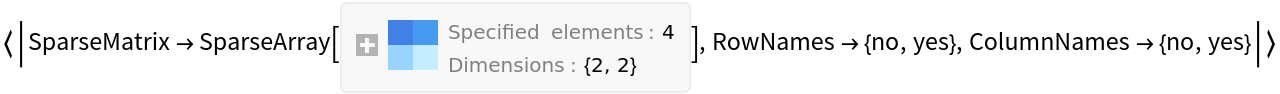mat = ResourceFunction["CrossTabulate"][dsRandomLabels, "Sparse" -> True]