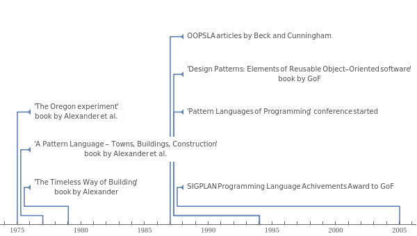 In 1975 the architect Christopher Alexander et al., [2], introduced a pattern language for architectural solutions. Alexander’s book “The Timeless Way of Building”, [3], is the more fundamental one -- some sort of philosophical prequel of [1] and [2].