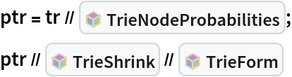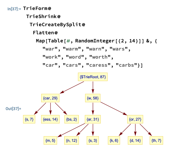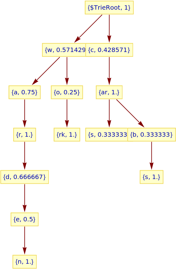 Here we convert the frequencies of the trie above into probabilities, shrink the obtained trie, and then plot it: