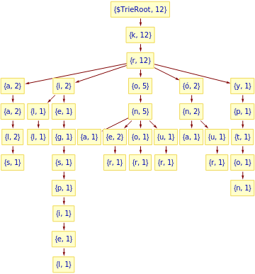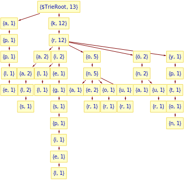 Here a new word -- its list of characters -- is inserted into the trie above: