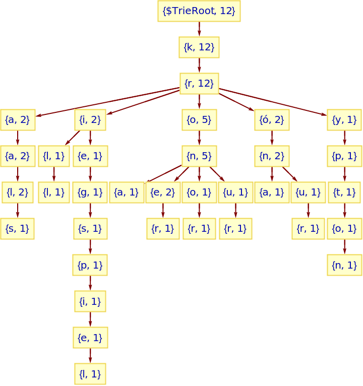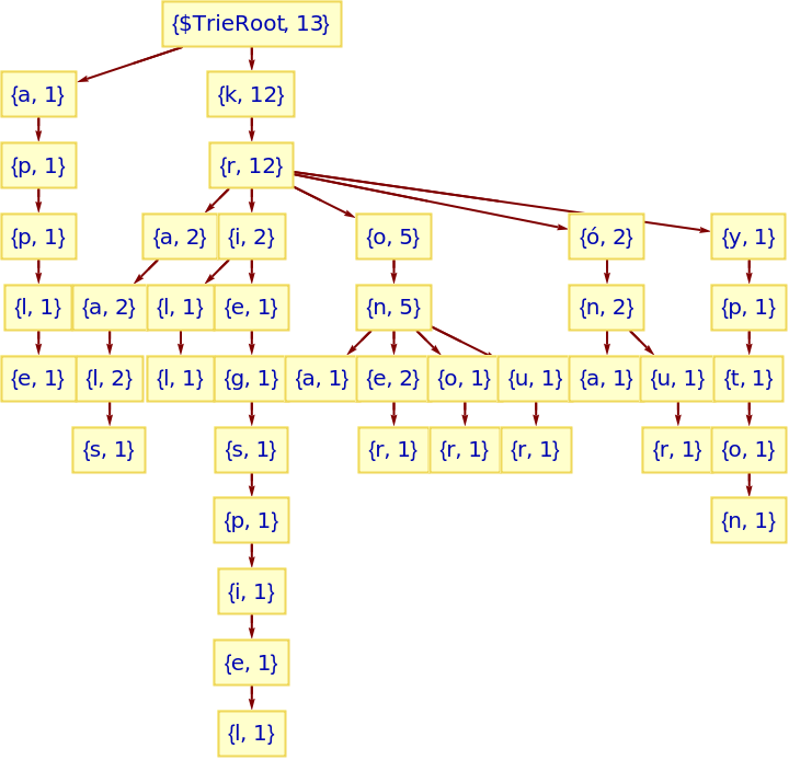 Here a new word -- its list of characters -- is inserted into the trie above: