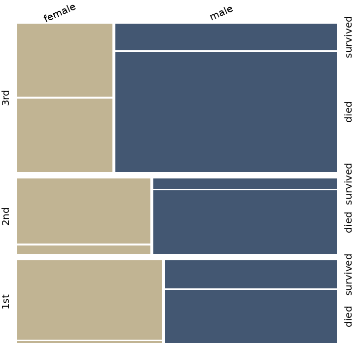 7. Further confirmation of the found variable importance can be done using the mosaic plots. We can see that female passengers are much more likely to survive and especially female passengers from first and second class: