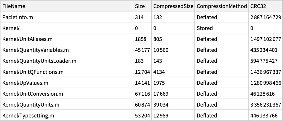 List the contents of the zip file with compression details: