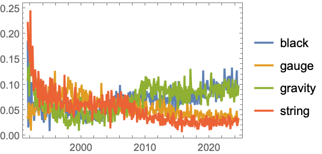 A DateListPlot showing the trends in the most popular title words in theoretical physics category (hep-th):