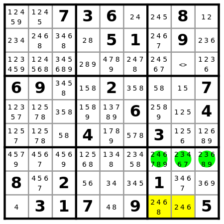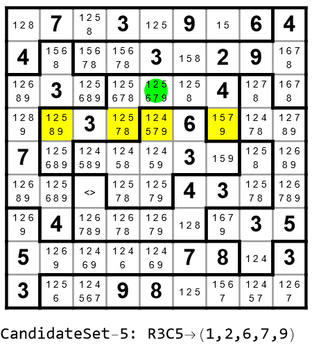 The four yellow cells are the candidate set for the candidate 5 in row 4, and therefore the number 5 has to be placed in one of these cells and can be removed from the green cell, that sees all cells of the candidate set. Observe that the candidate set is not locked in any other group, so this result is not found with the rule locked candidates.