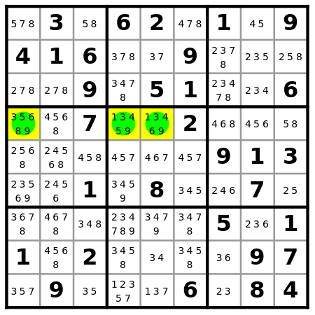 In row 4, the candidates 1, 3 and 9 can be placed only in the three yellow cells. Therefore, the other candidates can be removed from these cells.