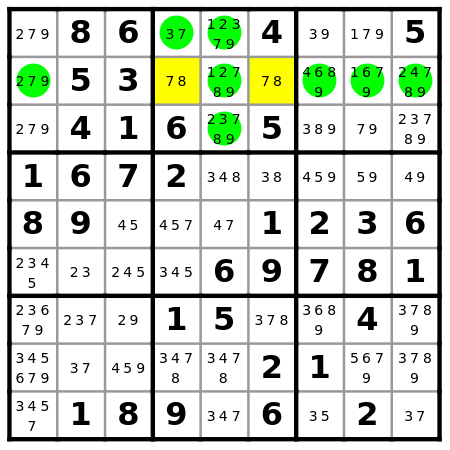 The only candidates in row 2 (or block 2) in the two yellow cells R2C4 and R2C6 are 7 and 8, so they have to be placed there. Therefore the candidates 7 and 8 can be removed from all cells that see this pair, the green cells.