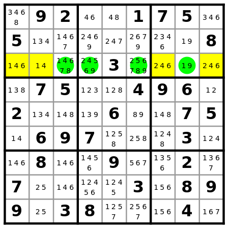 In the third row, the only candidates in the four yellow cells are 1, 2, 4 and 6. So they have to be placed in these four cells and therefore can be removed from all cells that see the yellow cells, in particular from the green cells.