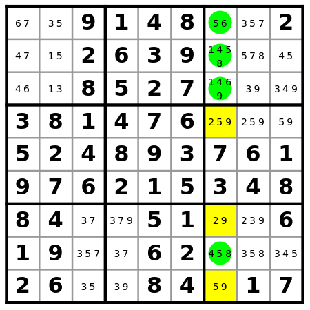 In column 7, the only candidates in the three yellow cells R4C7, R7C7 and R9C7 are 2, 5 and 9. So they have to be placed in these three cells and therefore can be removed from the green cells.
