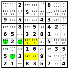 The four yellow cells are the only cells in the columns 4 and 5 with candidate 4. Moreover, these cells are in only two rows, 6 and 8. It follows that in each of these rows the candidate 4 has to be placed in one of the yellow cells, and therefore can be removed from all other cells in these rows.