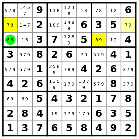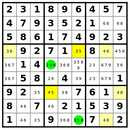 This is a longer XY-chain, for the candidate 5. Start in the dark yellow endpoint R4C6. If we do not have a 5 there, it is a 3, which implies R4C1=6, R4C8=4, R9C8=8, R7C9=4 and therefore in the other endpoint R7C4 we must have a 5. Therefore, the candidate 5 can be removed from the two cells R5C4 and R9C6, that see both endpoints.