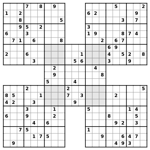 Each picture that we see above consists of cells. In some of the cells, the value is already given. That are the clues of the sudoku. The rows, columns, regular blocks and extra blocks are just groups of nine cells. Every sudoku problem amounts to the following: