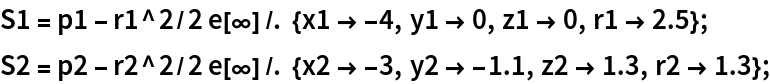 S2 = p2 - r2^2/2 e[\[Infinity]] /. {x2 -> -3, y2 -> -1.1, z2 -> 1.3, r2 -> 1.3};