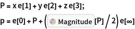 p = e[0] + P + (InterpretationBox[FrameBox[TagBox[TooltipBox[PaneBox[GridBox[List[List[GraphicsBox[List[Thickness[0.0025`], List[FaceForm[List[RGBColor[0.9607843137254902`, 0.5058823529411764`, 0.19607843137254902`], Opacity[1.`]]], FilledCurveBox[List[List[List[0, 2, 0], List[0, 1, 0], List[0, 1, 0], List[0, 1, 0], List[0, 1, 0]], List[List[0, 2, 0], List[0, 1, 0], List[0, 1, 0], List[0, 1, 0], List[0, 1, 0]], List[List[0, 2, 0], List[0, 1, 0], List[0, 1, 0], List[0, 1, 0], List[0, 1, 0], List[0, 1, 0]], List[List[0, 2, 0], List[1, 3, 3], List[0, 1, 0], List[1, 3, 3], List[0, 1, 0], List[1, 3, 3], List[0, 1, 0], List[1, 3, 3], List[1, 3, 3], List[0, 1, 0], List[1, 3, 3], List[0, 1, 0], List[1, 3, 3]]], List[List[List[205.`, 22.863691329956055`], List[205.`, 212.31669425964355`], List[246.01799774169922`, 235.99870109558105`], List[369.0710144042969`, 307.0436840057373`], List[369.0710144042969`, 117.59068870544434`], List[205.`, 22.863691329956055`]], List[List[30.928985595703125`, 307.0436840057373`], List[153.98200225830078`, 235.99870109558105`], List[195.`, 212.31669425964355`], List[195.`, 22.863691329956055`], List[30.928985595703125`, 117.59068870544434`], List[30.928985595703125`, 307.0436840057373`]], List[List[200.`, 410.42970085144043`], List[364.0710144042969`, 315.7036876678467`], List[241.01799774169922`, 244.65868949890137`], List[200.`, 220.97669792175293`], List[158.98200225830078`, 244.65868949890137`], List[35.928985595703125`, 315.7036876678467`], List[200.`, 410.42970085144043`]], List[List[376.5710144042969`, 320.03370475769043`], List[202.5`, 420.53370475769043`], List[200.95300006866455`, 421.42667961120605`], List[199.04699993133545`, 421.42667961120605`], List[197.5`, 420.53370475769043`], List[23.428985595703125`, 320.03370475769043`], List[21.882003784179688`, 319.1406993865967`], List[20.928985595703125`, 317.4896984100342`], List[20.928985595703125`, 315.7036876678467`], List[20.928985595703125`, 114.70369529724121`], List[20.928985595703125`, 112.91769218444824`], List[21.882003784179688`, 111.26669120788574`], List[23.428985595703125`, 110.37369346618652`], List[197.5`, 9.87369155883789`], List[198.27300024032593`, 9.426692008972168`], List[199.13700008392334`, 9.203690528869629`], List[200.`, 9.203690528869629`], List[200.86299991607666`, 9.203690528869629`], List[201.72699999809265`, 9.426692008972168`], List[202.5`, 9.87369155883789`], List[376.5710144042969`, 110.37369346618652`], List[378.1179962158203`, 111.26669120788574`], List[379.0710144042969`, 112.91769218444824`], List[379.0710144042969`, 114.70369529724121`], List[379.0710144042969`, 315.7036876678467`], List[379.0710144042969`, 317.4896984100342`], List[378.1179962158203`, 319.1406993865967`], List[376.5710144042969`, 320.03370475769043`]]]]], List[FaceForm[List[RGBColor[0.5529411764705883`, 0.6745098039215687`, 0.8117647058823529`], Opacity[1.`]]], FilledCurveBox[List[List[List[0, 2, 0], List[0, 1, 0], List[0, 1, 0], List[0, 1, 0]]], List[List[List[44.92900085449219`, 282.59088134765625`], List[181.00001525878906`, 204.0298843383789`], List[181.00001525878906`, 46.90887451171875`], List[44.92900085449219`, 125.46986389160156`], List[44.92900085449219`, 282.59088134765625`]]]]], List[FaceForm[List[RGBColor[0.6627450980392157`, 0.803921568627451`, 0.5686274509803921`], Opacity[1.`]]], FilledCurveBox[List[List[List[0, 2, 0], List[0, 1, 0], List[0, 1, 0], List[0, 1, 0]]], List[List[List[355.0710144042969`, 282.59088134765625`], List[355.0710144042969`, 125.46986389160156`], List[219.`, 46.90887451171875`], List[219.`, 204.0298843383789`], List[355.0710144042969`, 282.59088134765625`]]]]], List[FaceForm[List[RGBColor[0.6901960784313725`, 0.5882352941176471`, 0.8117647058823529`], Opacity[1.`]]], FilledCurveBox[List[List[List[0, 2, 0], List[0, 1, 0], List[0, 1, 0], List[0, 1, 0]]], List[List[List[200.`, 394.0606994628906`], List[336.0710144042969`, 315.4997024536133`], List[200.`, 236.93968200683594`], List[63.928985595703125`, 315.4997024536133`], List[200.`, 394.0606994628906`]]]]]], List[Rule[BaselinePosition, Scaled[0.15`]], Rule[ImageSize, 10], Rule[ImageSize, 15]]], StyleBox[RowBox[List["Magnitude", " "]], Rule[ShowAutoStyles, False], Rule[ShowStringCharacters, False], Rule[FontSize, Times[0.9`, Inherited]], Rule[FontColor, GrayLevel[0.1`]]]]], Rule[GridBoxSpacings, List[Rule["Columns", List[List[0.25`]]]]]], Rule[Alignment, List[Left, Baseline]], Rule[BaselinePosition, Baseline], Rule[FrameMargins, List[List[3, 0], List[0, 0]]], Rule[BaseStyle, List[Rule[LineSpacing, List[0, 0]], Rule[LineBreakWithin, False]]]], RowBox[List["PacletSymbol", "[", RowBox[List["\"Jlaragonvera/CGAlgebra\"", ",", "\"Jlaragonvera`CGAlgebra`Magnitude\""]], "]"]], Rule[TooltipStyle, List[Rule[ShowAutoStyles, True], Rule[ShowStringCharacters, True]]]], Function[Annotation[Slot[1], Style[Defer[PacletSymbol["Jlaragonvera/CGAlgebra", "Jlaragonvera`CGAlgebra`Magnitude"]], Rule[ShowStringCharacters, True]], "Tooltip"]]], Rule[Background, RGBColor[0.968`, 0.976`, 0.984`]], Rule[BaselinePosition, Baseline], Rule[DefaultBaseStyle, List[]], Rule[FrameMargins, List[List[0, 0], List[1, 1]]], Rule[FrameStyle, RGBColor[0.831`, 0.847`, 0.85`]], Rule[RoundingRadius, 4]], PacletSymbol["Jlaragonvera/CGAlgebra", "Jlaragonvera`CGAlgebra`Magnitude"], Rule[Selectable, False], Rule[SelectWithContents, True], Rule[BoxID, "PacletSymbolBox"]][P]/2) e[\[Infinity]]