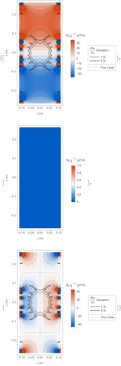 Show where the coil field deviates from the desired field harmonic by 0.1%, 1% and 10%, using custom styling: