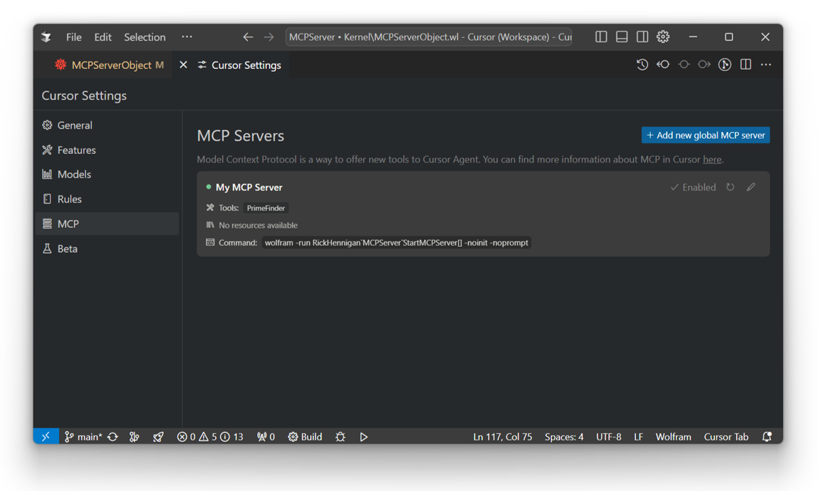 Check the MCP tab in Cursor settings to verify that the server is recognized: