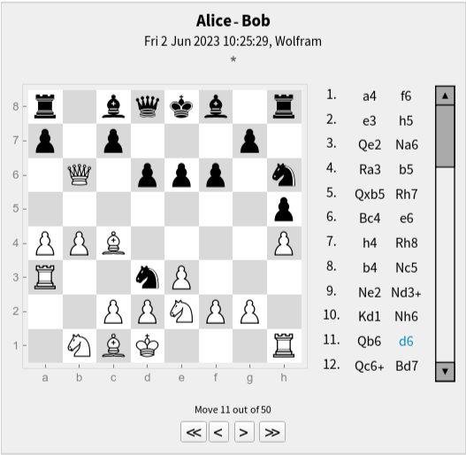 Generate a random game between Alice and Bob of up to a 100 moves: