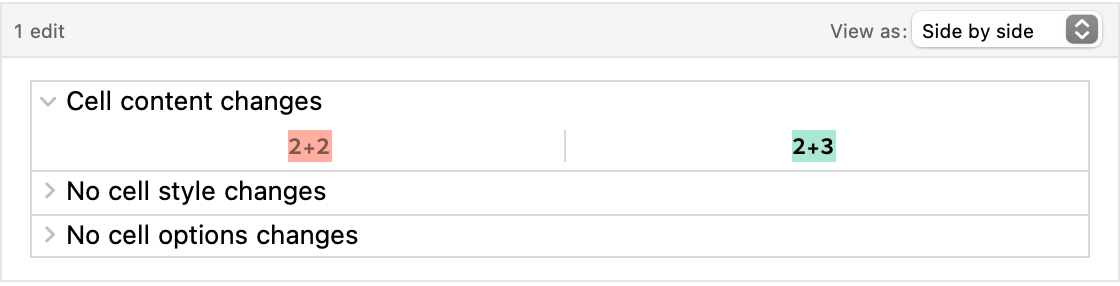 A key feature of Wolfram/DiffTools is its ability to make sense of changes to notebook files and