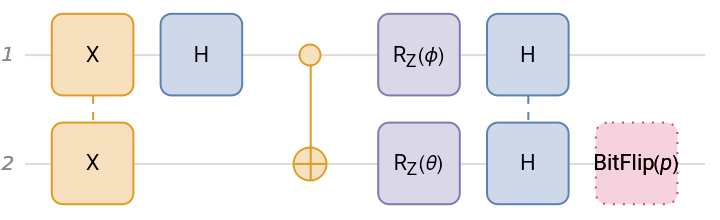 qc = InterpretationBox[FrameBox[TagBox[TooltipBox[PaneBox[GridBox[List[List[GraphicsBox[List[Thickness[0.0025`], List[FaceForm[List[RGBColor[0.9607843137254902`, 0.5058823529411764`, 0.19607843137254902`], Opacity[1.`]]], FilledCurveBox[List[List[List[0, 2, 0], List[0, 1, 0], List[0, 1, 0], List[0, 1, 0], List[0, 1, 0]], List[List[0, 2, 0], List[0, 1, 0], List[0, 1, 0], List[0, 1, 0], List[0, 1, 0]], List[List[0, 2, 0], List[0, 1, 0], List[0, 1, 0], List[0, 1, 0], List[0, 1, 0], List[0, 1, 0]], List[List[0, 2, 0], List[1, 3, 3], List[0, 1, 0], List[1, 3, 3], List[0, 1, 0], List[1, 3, 3], List[0, 1, 0], List[1, 3, 3], List[1, 3, 3], List[0, 1, 0], List[1, 3, 3], List[0, 1, 0], List[1, 3, 3]]], List[List[List[205.`, 22.863691329956055`], List[205.`, 212.31669425964355`], List[246.01799774169922`, 235.99870109558105`], List[369.0710144042969`, 307.0436840057373`], List[369.0710144042969`, 117.59068870544434`], List[205.`, 22.863691329956055`]], List[List[30.928985595703125`, 307.0436840057373`], List[153.98200225830078`, 235.99870109558105`], List[195.`, 212.31669425964355`], List[195.`, 22.863691329956055`], List[30.928985595703125`, 117.59068870544434`], List[30.928985595703125`, 307.0436840057373`]], List[List[200.`, 410.42970085144043`], List[364.0710144042969`, 315.7036876678467`], List[241.01799774169922`, 244.65868949890137`], List[200.`, 220.97669792175293`], List[158.98200225830078`, 244.65868949890137`], List[35.928985595703125`, 315.7036876678467`], List[200.`, 410.42970085144043`]], List[List[376.5710144042969`, 320.03370475769043`], List[202.5`, 420.53370475769043`], List[200.95300006866455`, 421.42667961120605`], List[199.04699993133545`, 421.42667961120605`], List[197.5`, 420.53370475769043`], List[23.428985595703125`, 320.03370475769043`], List[21.882003784179688`, 319.1406993865967`], List[20.928985595703125`, 317.4896984100342`], List[20.928985595703125`, 315.7036876678467`], List[20.928985595703125`, 114.70369529724121`], List[20.928985595703125`, 112.91769218444824`], List[21.882003784179688`, 111.26669120788574`], List[23.428985595703125`, 110.37369346618652`], List[197.5`, 9.87369155883789`], List[198.27300024032593`, 9.426692008972168`], List[199.13700008392334`, 9.203690528869629`], List[200.`, 9.203690528869629`], List[200.86299991607666`, 9.203690528869629`], List[201.72699999809265`, 9.426692008972168`], List[202.5`, 9.87369155883789`], List[376.5710144042969`, 110.37369346618652`], List[378.1179962158203`, 111.26669120788574`], List[379.0710144042969`, 112.91769218444824`], List[379.0710144042969`, 114.70369529724121`], List[379.0710144042969`, 315.7036876678467`], List[379.0710144042969`, 317.4896984100342`], List[378.1179962158203`, 319.1406993865967`], List[376.5710144042969`, 320.03370475769043`]]]]], List[FaceForm[List[RGBColor[0.5529411764705883`, 0.6745098039215687`, 0.8117647058823529`], Opacity[1.`]]], FilledCurveBox[List[List[List[0, 2, 0], List[0, 1, 0], List[0, 1, 0], List[0, 1, 0]]], List[List[List[44.92900085449219`, 282.59088134765625`], List[181.00001525878906`, 204.0298843383789`], List[181.00001525878906`, 46.90887451171875`], List[44.92900085449219`, 125.46986389160156`], List[44.92900085449219`, 282.59088134765625`]]]]], List[FaceForm[List[RGBColor[0.6627450980392157`, 0.803921568627451`, 0.5686274509803921`], Opacity[1.`]]], FilledCurveBox[List[List[List[0, 2, 0], List[0, 1, 0], List[0, 1, 0], List[0, 1, 0]]], List[List[List[355.0710144042969`, 282.59088134765625`], List[355.0710144042969`, 125.46986389160156`], List[219.`, 46.90887451171875`], List[219.`, 204.0298843383789`], List[355.0710144042969`, 282.59088134765625`]]]]], List[FaceForm[List[RGBColor[0.6901960784313725`, 0.5882352941176471`, 0.8117647058823529`], Opacity[1.`]]], FilledCurveBox[List[List[List[0, 2, 0], List[0, 1, 0], List[0, 1, 0], List[0, 1, 0]]], List[List[List[200.`, 394.0606994628906`], List[336.0710144042969`, 315.4997024536133`], List[200.`, 236.93968200683594`], List[63.928985595703125`, 315.4997024536133`], List[200.`, 394.0606994628906`]]]]]], List[Rule[BaselinePosition, Scaled[0.15`]], Rule[ImageSize, 10], Rule[ImageSize, 15]]], StyleBox[RowBox[List["QuantumCircuitOperator", " "]], Rule[ShowAutoStyles, False], Rule[ShowStringCharacters, False], Rule[FontSize, Times[0.9`, Inherited]], Rule[FontColor, GrayLevel[0.1`]]]]], Rule[GridBoxSpacings, List[Rule["Columns", List[List[0.25`]]]]]], Rule[Alignment, List[Left, Baseline]], Rule[BaselinePosition, Baseline], Rule[FrameMargins, List[List[3, 0], List[0, 0]]], Rule[BaseStyle, List[Rule[LineSpacing, List[0, 0]], Rule[LineBreakWithin, False]]]], RowBox[List["PacletSymbol", "[", RowBox[List["\"Wolfram/QuantumFramework\"", ",", "\"Wolfram`QuantumFramework`QuantumCircuitOperator\""]], "]"]], Rule[TooltipStyle, List[Rule[ShowAutoStyles, True], Rule[ShowStringCharacters, True]]]], Function[Annotation[Slot[1], Style[Defer[PacletSymbol["Wolfram/QuantumFramework", "Wolfram`QuantumFramework`QuantumCircuitOperator"]], Rule[ShowStringCharacters, True]], "Tooltip"]]], Rule[Background, RGBColor[0.968`, 0.976`, 0.984`]], Rule[BaselinePosition, Baseline], Rule[DefaultBaseStyle, List[]], Rule[FrameMargins, List[List[0, 0], List[1, 1]]], Rule[FrameStyle, RGBColor[0.831`, 0.847`, 0.85`]], Rule[RoundingRadius, 4]], PacletSymbol["Wolfram/QuantumFramework", "Wolfram`QuantumFramework`QuantumCircuitOperator"], Rule[Selectable, False], Rule[SelectWithContents, True], Rule[BoxID, "PacletSymbolBox"]][{"X" -> {1, 2}, "H", "CNOT", "RZ"[\[Phi]], "RZ"[\[Theta]] -> 2, "H" -> {1, 2}, {1}, {2}}];