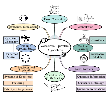 VQAs have been explored for a wide range of applications, spanning nearly all areas initially envisioned for quantum computing. As illustrated in the following image, VQAs are applied across various domains, including error correction, machine learning, combinatorial optimization, ground-state estimation, and mathematical problem-solving.