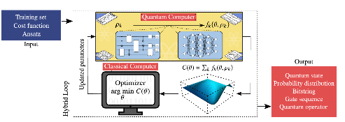 This process is best illustrated in the Hybrid Loop shown in the next image. The quantum computer runs the ansatz, the results are evaluated through the cost function, and the classical optimizer processes this information to update the parameters for the next iteration.