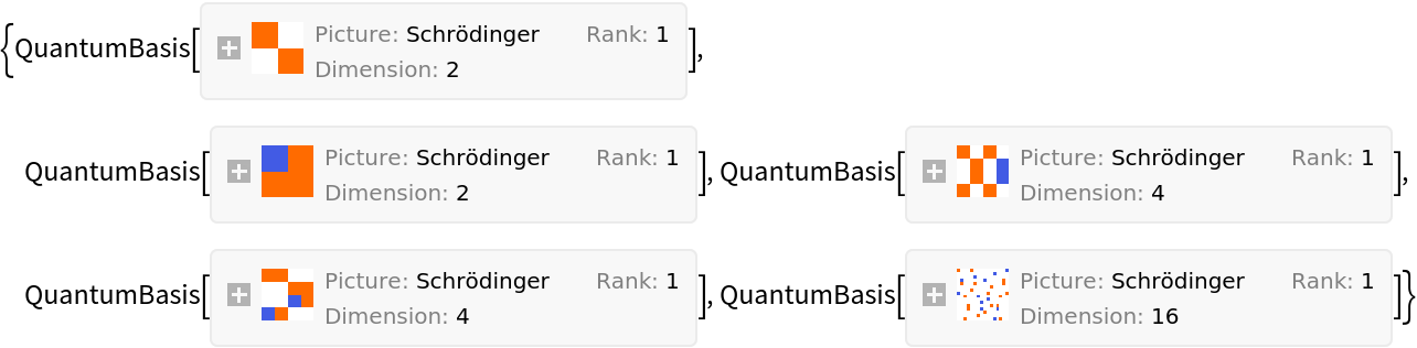 In order to use QuantumBasis, one gives dimension information as arguments, which will be interpreted as the computational basis. Alternatively, an association can be given with the basis name as the key and the corresponding basis elements as the values.