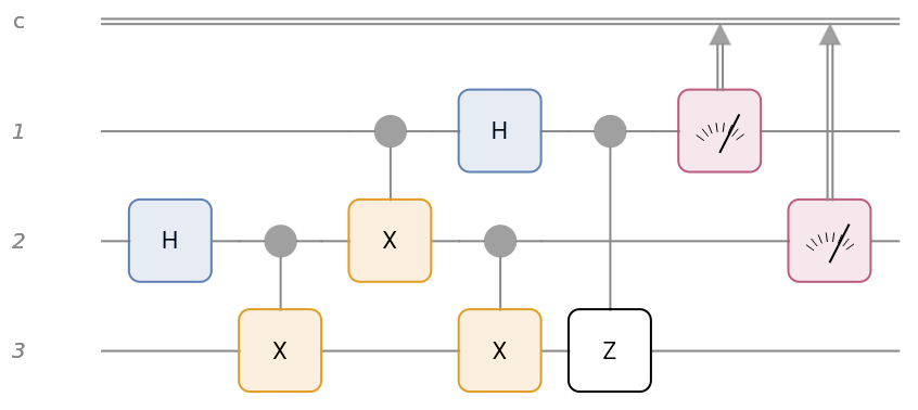 Quantum teleportation is the reverse of superdense coding. Here, one wants to teleport a generic unknown quantum bit. Suppose that Alice wants to send a qubit (qubit 1) to Bob. To implement a quantum circuit for teleporting a qubit, Alice and Bob share an entangled state (qubits 2 and 3). Qubits 1 and 2 represent Alice's system, while qubit 3 is Bob's. The goal is to transfer the state of Alice's first qubit to Bob's qubit.