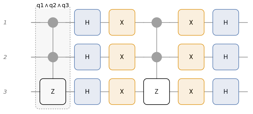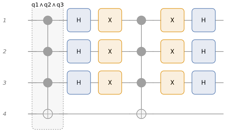 The goal of Grover's search algorithm is to find solutions of a Boolean function . This can be done using the named-circuits or oracles in our quantum framework.