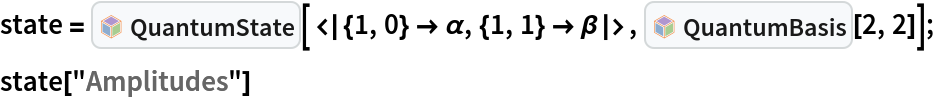 With a built-in basis specified, amplitudes correspond to the basis elements. For example, use the Bell basis: