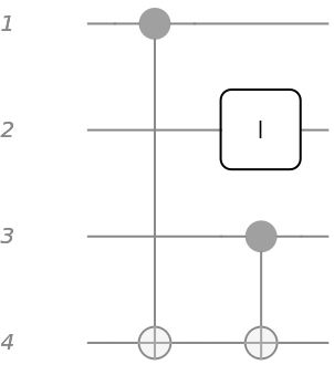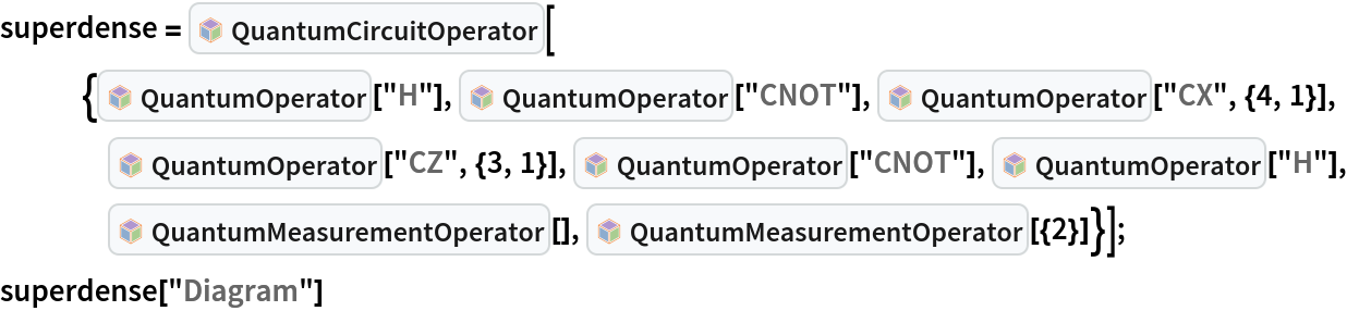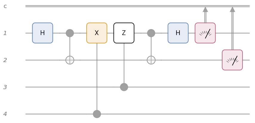 Define an initial state as , where is the code that Alice wants to send Bob, which is encoded in two ancillary qubits (qubits 3 and 4).