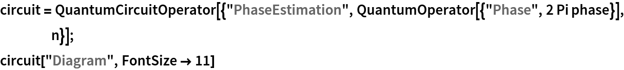 To specify the corresponding quantum circuit, one can use the built-in circuit "PhaseEstimation" that takes two input arguments: a unitary operator U and an integer n. The integer n specifies the number of qubits and controlled-Uj operators in the circuit, with j=0,1,…,n-1. The accuracy of phase estimation and the success probability depends on n: