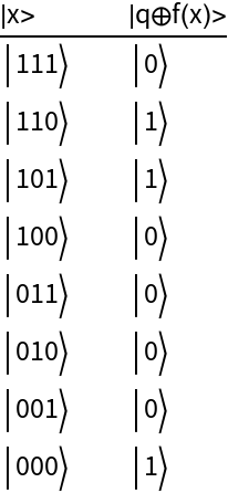 Prepare the 4-qubit in the previous circuit (i.e. the ancillary qubit) as a 0-state, and then other qubits (1–3) in the index register states. To compare with the truth table, create the index register states |x> in the order |2n-1> down to |0: