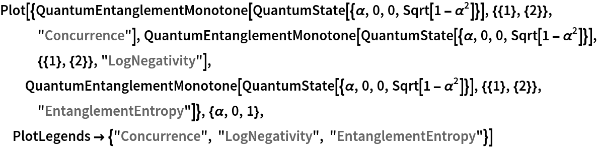 There are several metrics by which one can measure entanglement between two qudits, such as concurrence, entanglement entropy, negativity, etc. The calculation of entanglement measure is represented by the QuantumEntanglementMonotone function.